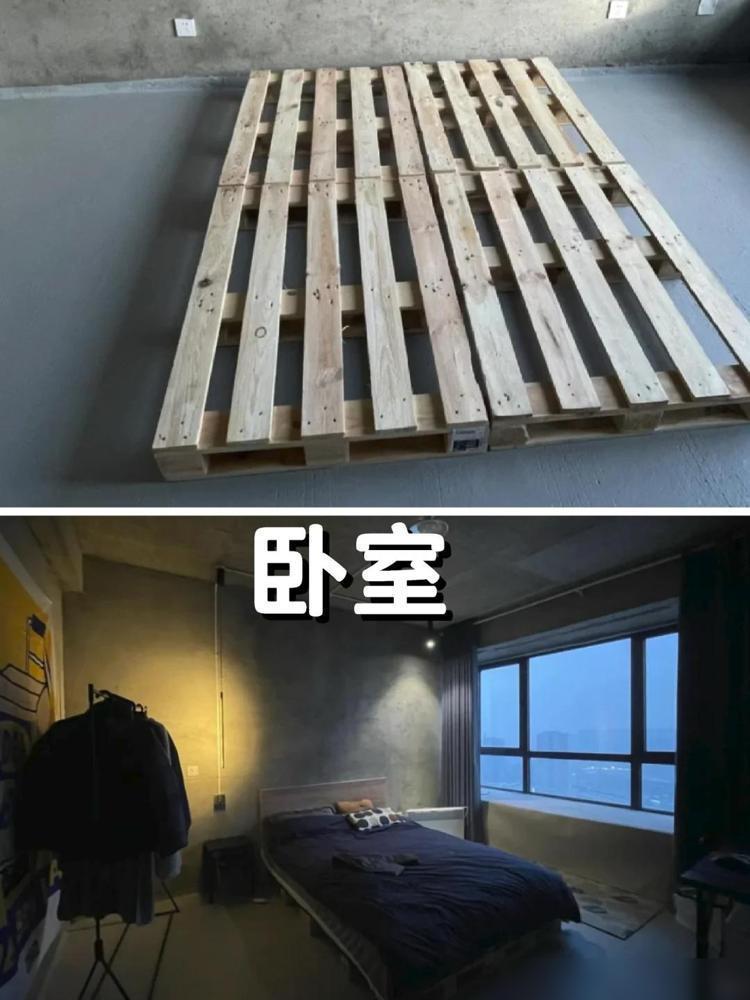 卧室卧室虽然没有床板床垫,但是白色墙壁上的木托盘组成了床架,使得这个床架看起来并不奇怪,也不会给人重力分布不合理的感觉。